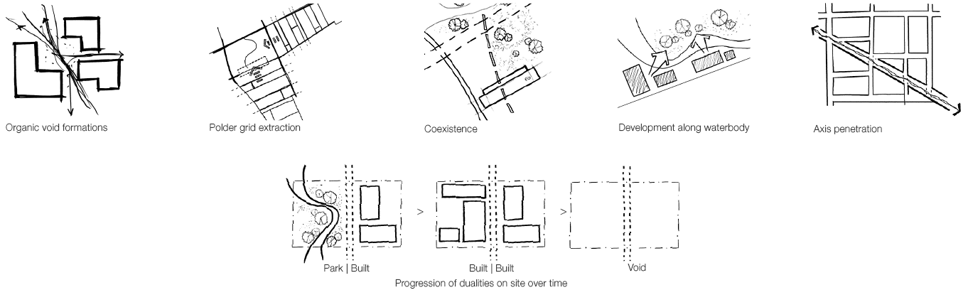The Hague started evolving from a city that just served its citizens, to a corporal superpower that wants to compete with well-known metropols around the world. With the developments in and around there is a certain transition towards rigidity. We wish to reintroduce and slow down the transition through a narrative and extracts from the historical layers of the site. The site experiences a progression of dualities overtime, from a setting of : Built | Green, > Built | Built , > [Void].